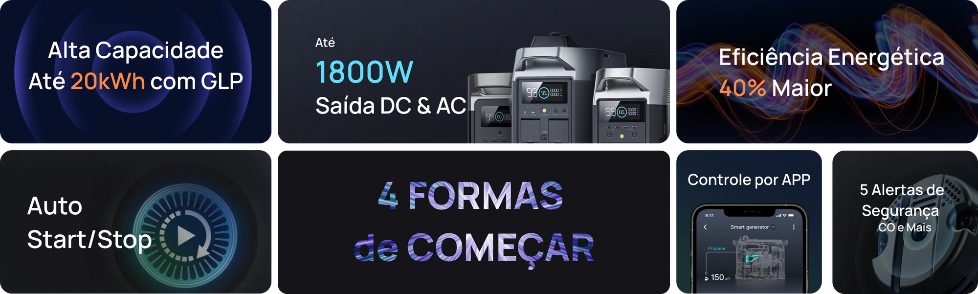 Apresentamos a solução de energia de backup definitiva para acompanhar sua estação de energia portátil (DELTA Pro/Max/Power Kits). O EcoFlow Smart Generator, agora com suporte a combustível duplo. Ele é mais inteligente, e com propano é mais eficiente e intuitivo do que os demais, tudo isso enquanto se integra perfeitamente com seus EcoFlow DELTA Max, Pro e Power Kits.