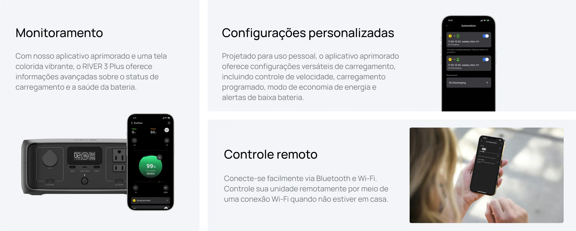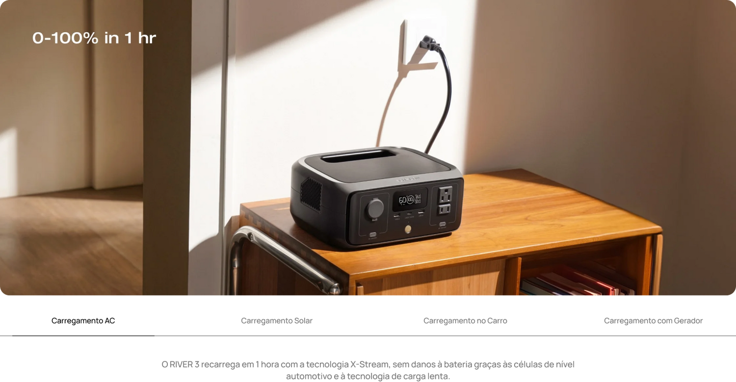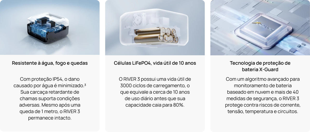 Em caso de queda de energia, a tomada AC será automaticamente alimentada pelo RIVER 3 em apenas 20 ms, quase imperceptível. Isso mantém aparelhos vitais funcionando, como armazenamento de alimentos, segurança e comunicação. Experimente uma transição automática e contínua para garantir total tranquilidade.