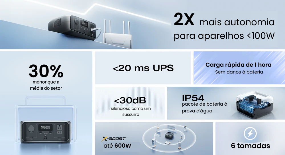 O RIVER 3 mantém 90% dos seus aparelhos essenciais funcionando com 300W de potência. Com a tecnologia X-Boost, ele alimenta dispositivos de aquecimento de 600W sem esforço. Garanta o funcionamento contínuo dos seus itens essenciais, mesmo durante apagões ou aventuras ao ar livre.